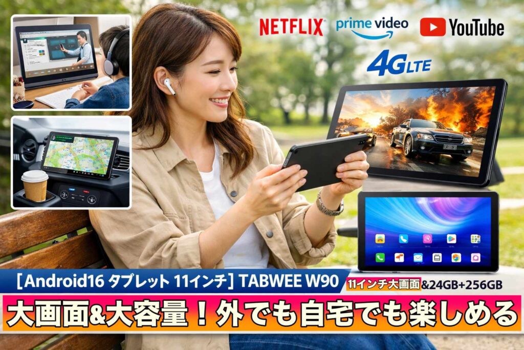 TABWEEタブレットW90は、11インチの見やすい大画面に、Android 16対応、24GB相当メモリ、256GB保存容量、4G LTE対応までそろった使い勝手のよいタブレットです。動画視聴、オンライン学習、外出先利用まで幅広くこなせるのが魅力です。ここでは、口コミや... -