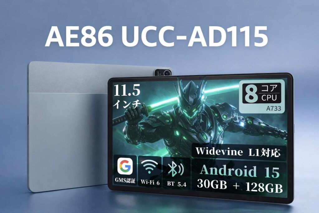 AE86タブレットUCC-AD115は、11.5インチの高精細ディスプレイとAndroid 15、Wi-Fi 6、Widevine L1対応を備えた、普段使いしやすい大画面タブレットです。高解像度の2800×1840表示や、プライベートスペースを含むAndroid 15の新機能が魅力で、動画鑑賞、読... -