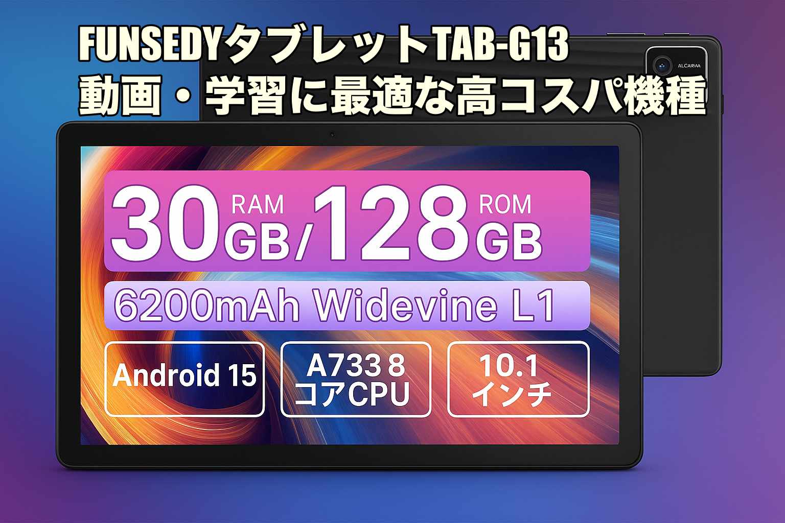 動画視聴やネット、学習用のタブレットを探している人に人気となっているのが「FUNSEDYタブレットTAB-G13」です。A733高性能8コアCPUとAndroid 15を搭載し、Wi-Fi6やWidevine L1、高速メモリ30GBなど、同価格帯では見られない充実した性能が魅力です。口コミでも動作の軽さや画質、使い勝手の良さが高く評価されています。