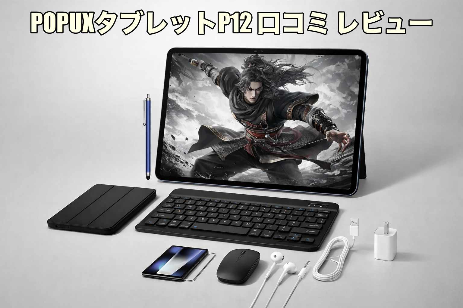 良い口コミとして最後に挙がりやすいのが、付属品の多さによるお得感です。POPUXタブレットP12には、キーボード、マウス、専用ケース、タッチペン、強化ガラスフィルム、有線イヤホンが付属しているため、買ってすぐ使い始めやすいです。普通は本体を買ったあとに、ケースや保護フィルム、キーボードなどを別で選ぶ必要がありますが、このモデルはその手間を減らしやすいです。