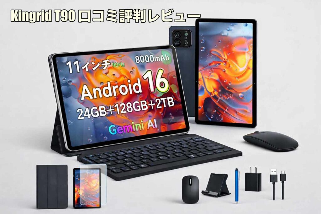 Kingrid T90タブレットは、11インチFHD画面、Widevine L1対応、T615搭載、8000mAhバッテリー、さらにキーボードやマウスまで付くセット内容が魅力のAndroidタブレットです。商品ページではAndroid 16、128GB保存、2TB拡張対応、レビュー評価4.5/5も確認で...